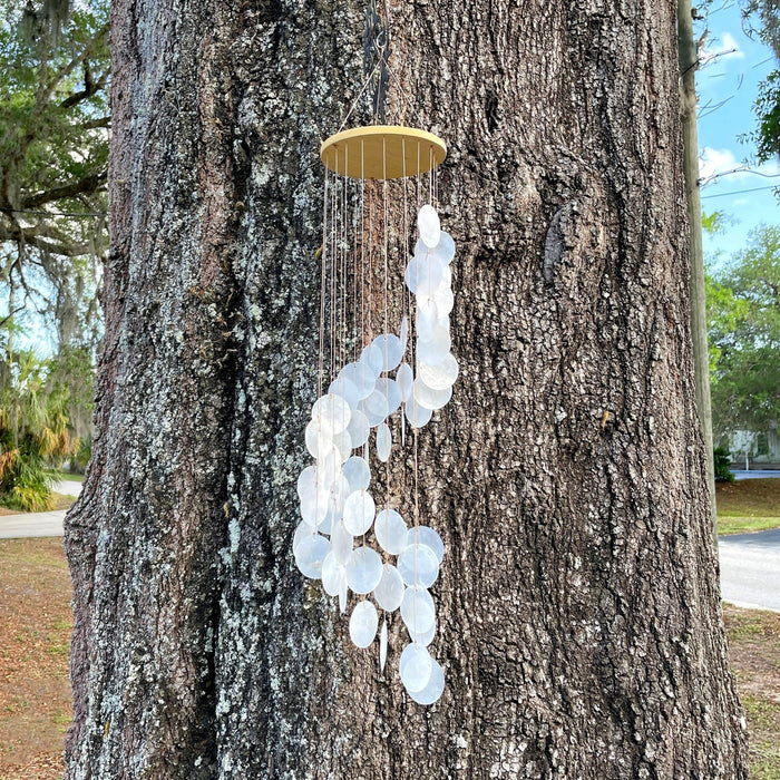 - Natural Shells – Crafted from genuine white capiz shells, each wind chime is unique with subtle variations in color and shape